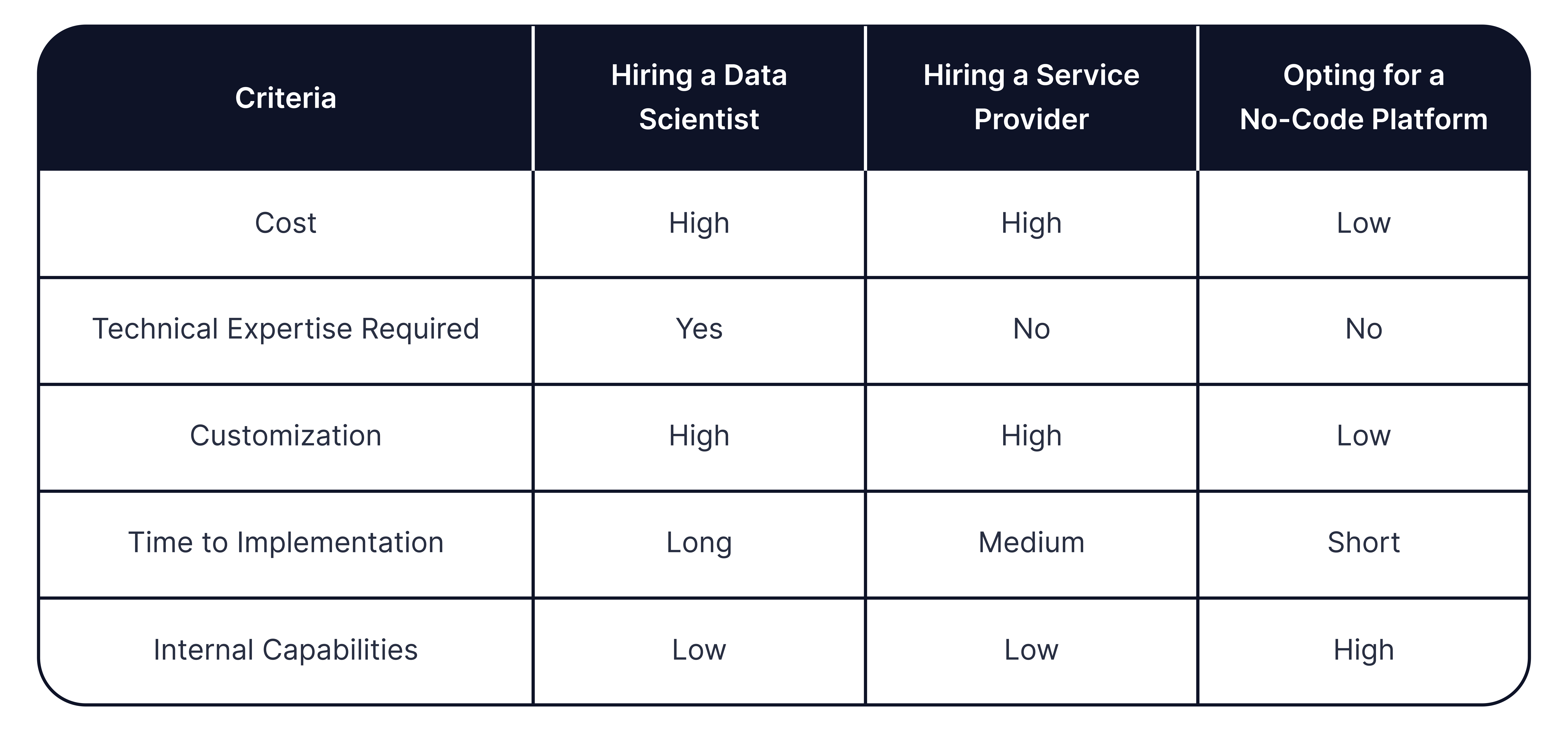 In conclusion, there are several options available for organizations looking to adopt AI. While hiring a data scientist or engaging a service provider may be appropriate for some organizations, opting for a no-code platform can provide a cost-effective, easy-to-use, and scalable option for building and implementing AI solutions.